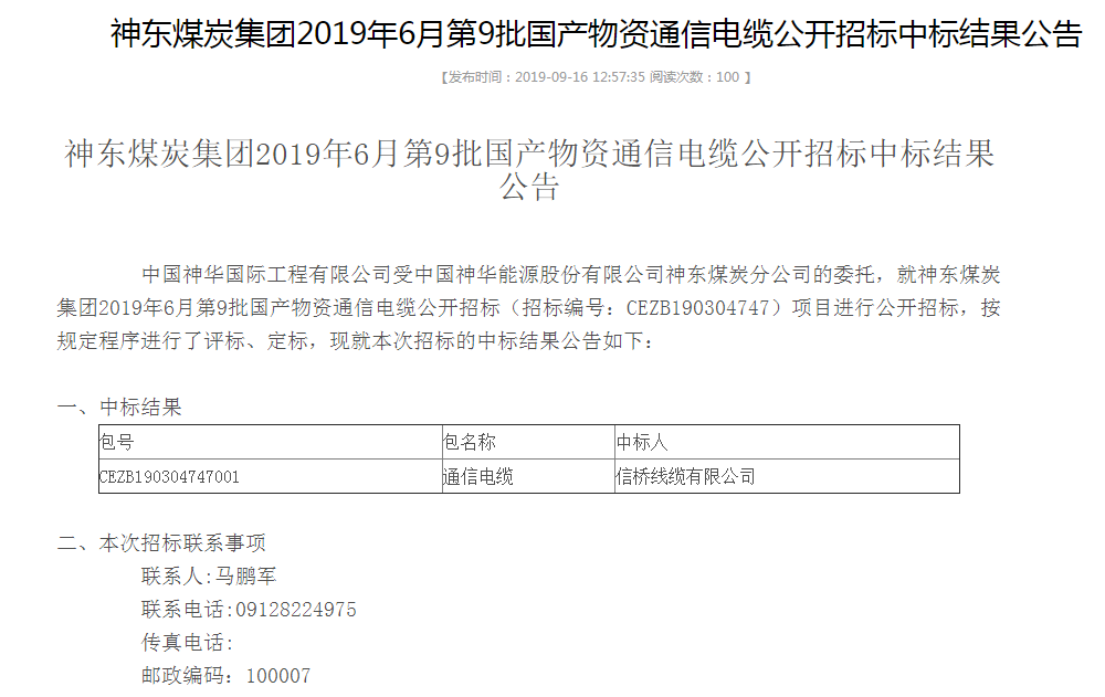點擊數(shù):64252019-11-21 00:00:00 來源: 神東煤炭集團(tuán)2019年6月第9批國產(chǎn)物資通信電纜公開招標(biāo)中標(biāo)結(jié)果公告